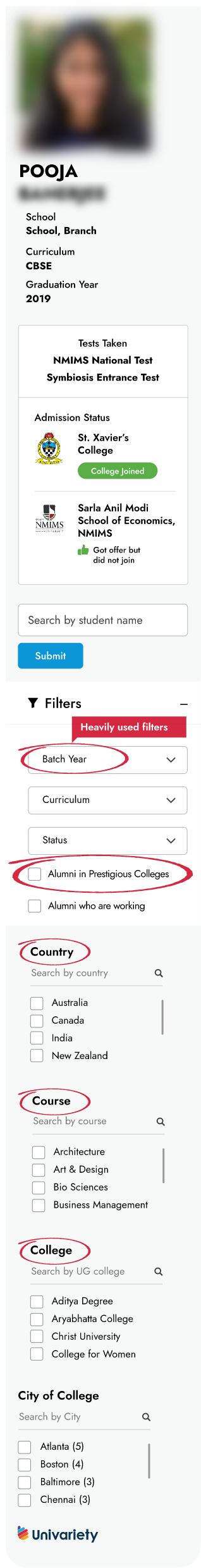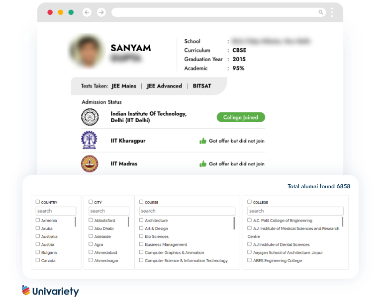 Right from entrance exams taken to colleges applied and admitted to, students can view their alumni journeys. The unique platform enables students to filter by interest and view thousands of alumni profiles.